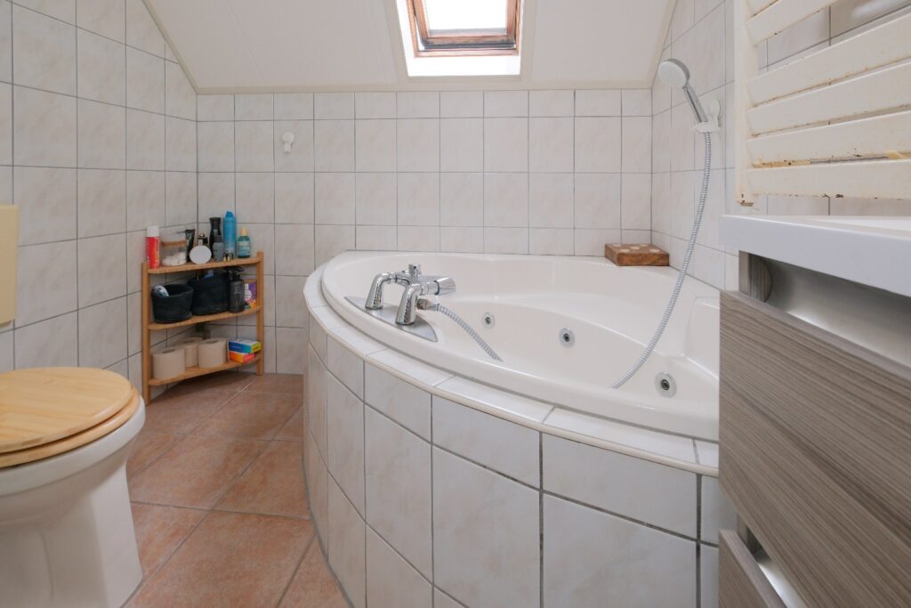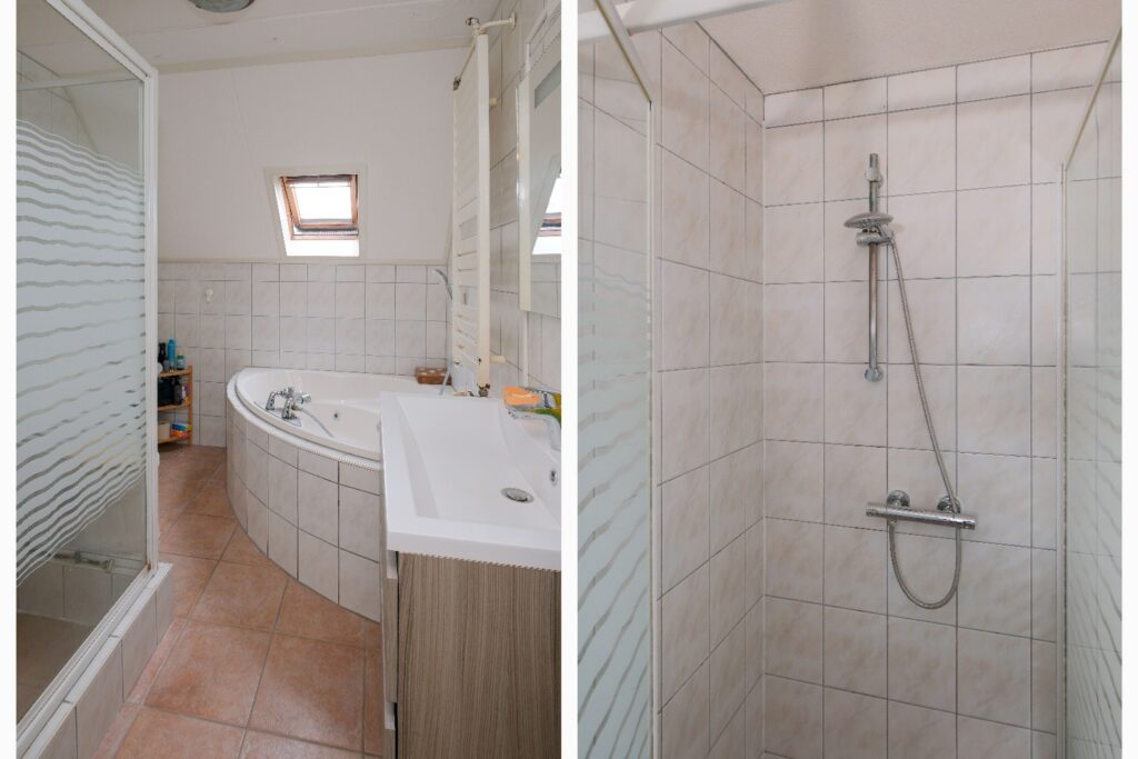 overloop, 3 slaapkamers en badkamer voorzien van hoekbad (whirlpool) , toilet, douchecabine en wastafel in meubel. Middels vaste trap naar...