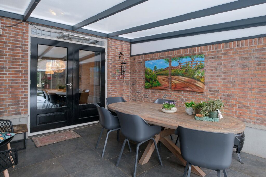 Onder de overkapping kunt u het hele jaar door comfortabel buiten zitten, terwijl de tuin ruimte biedt om te spelen of in alle rust te ontspannen.